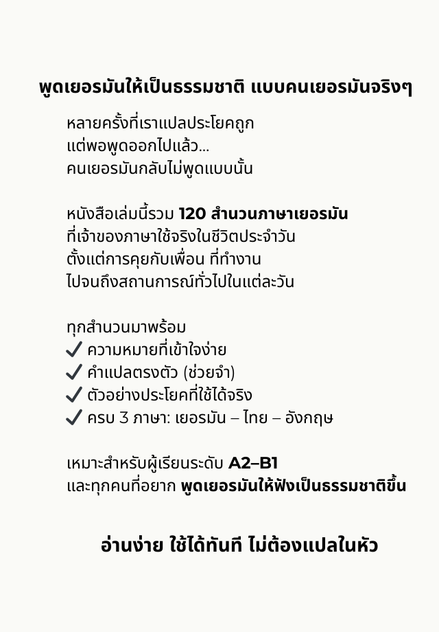 ไม่ว่าคุณจะเป็นผู้เริ่มต้นหรือผู้เรียนขั้นสูง หนังสือเล่มนี้ก็พร้อมช่วยให้คุณเข้าใจและนำสำนวนภาษาเยอรมันไปใช้ได้อย่างมั่นใจ